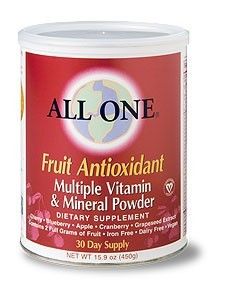 ALL ONE Fruit Antioxidant Formula is a high potency multi vitamin and mineral powder in a base of dairy-free rice protein and a blend of antioxidant rich fruit pigments.