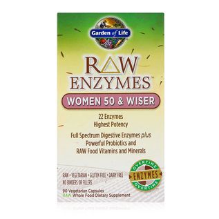 Garden of Life RAW Enzymes Women 50 & Wiser delivers higher activity per serving of a broader range of enzymes than any other digestive formula.? RAW Enzymes Women 50 & Wiser provides 22 powerful digestive enzymes, with increased carb-digesting enzymes (relative to the other RAW Enzymes formulas), as well as increases proteases in order to meet the needs of women 50+. RAW Enzymes also contains probiotic-created vitamins, minerals and antioxidant enzymes, including glutathione, catalase and SOD along with powerful probiotics that provide added support and act as ?enzyme factories??generating additional enzymes?working overtime for extraordinary digestive health.? Enzymes can aid in the digestion of dairy, grains, sugars, nuts, seeds, beans, broccoli and cabbage as well as other difficult-to-digest foods. As women age, they tend to experience a drop in stomach acid production which impacts protein digestion. RAW Enzymes Women 50 & Wiser has been specifically formulated to meet the unique digestive and overall health needs of women over 50?with amplified strength of carbohydrate-digesting enzymes plus powerful protein-digesting enzymes.?